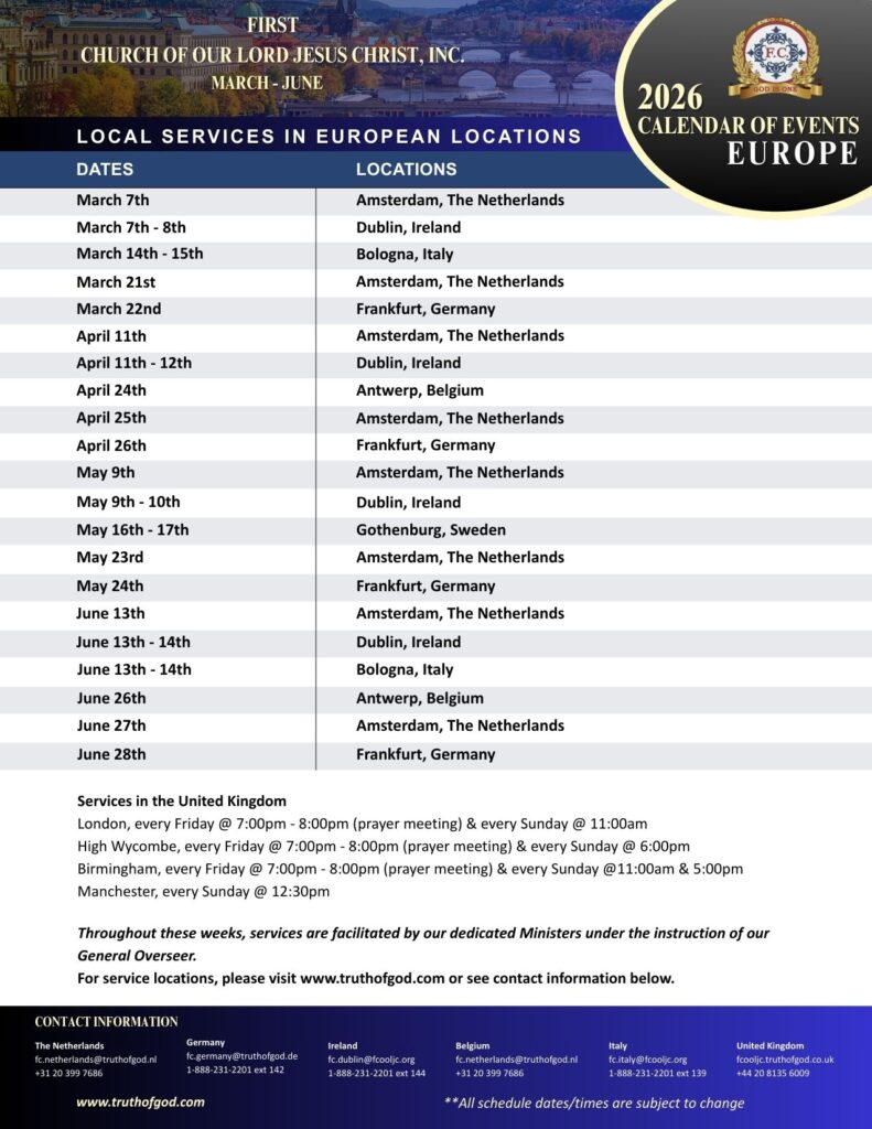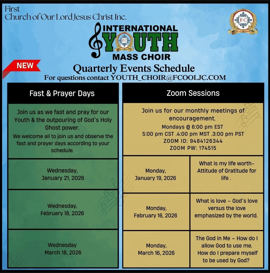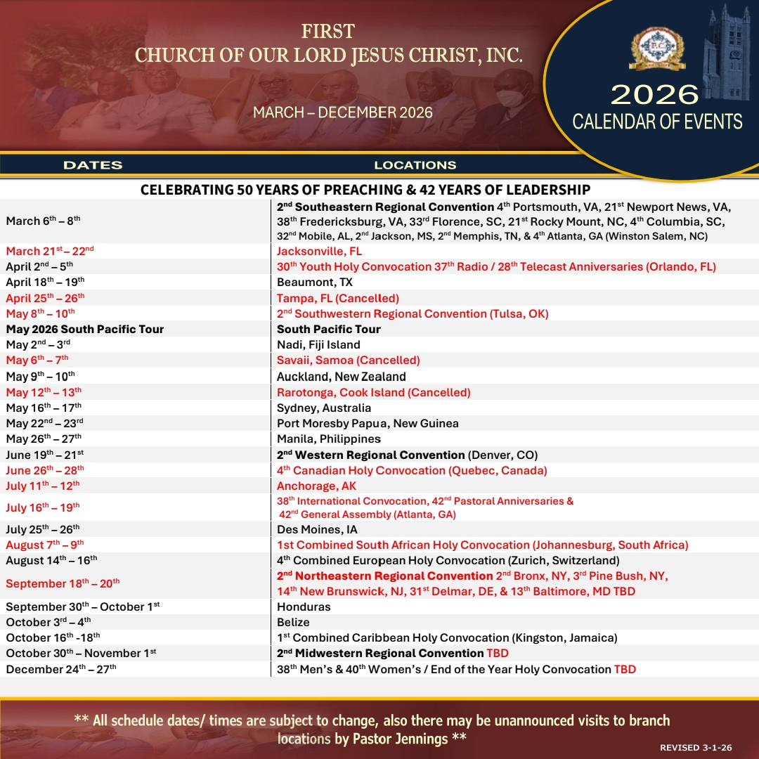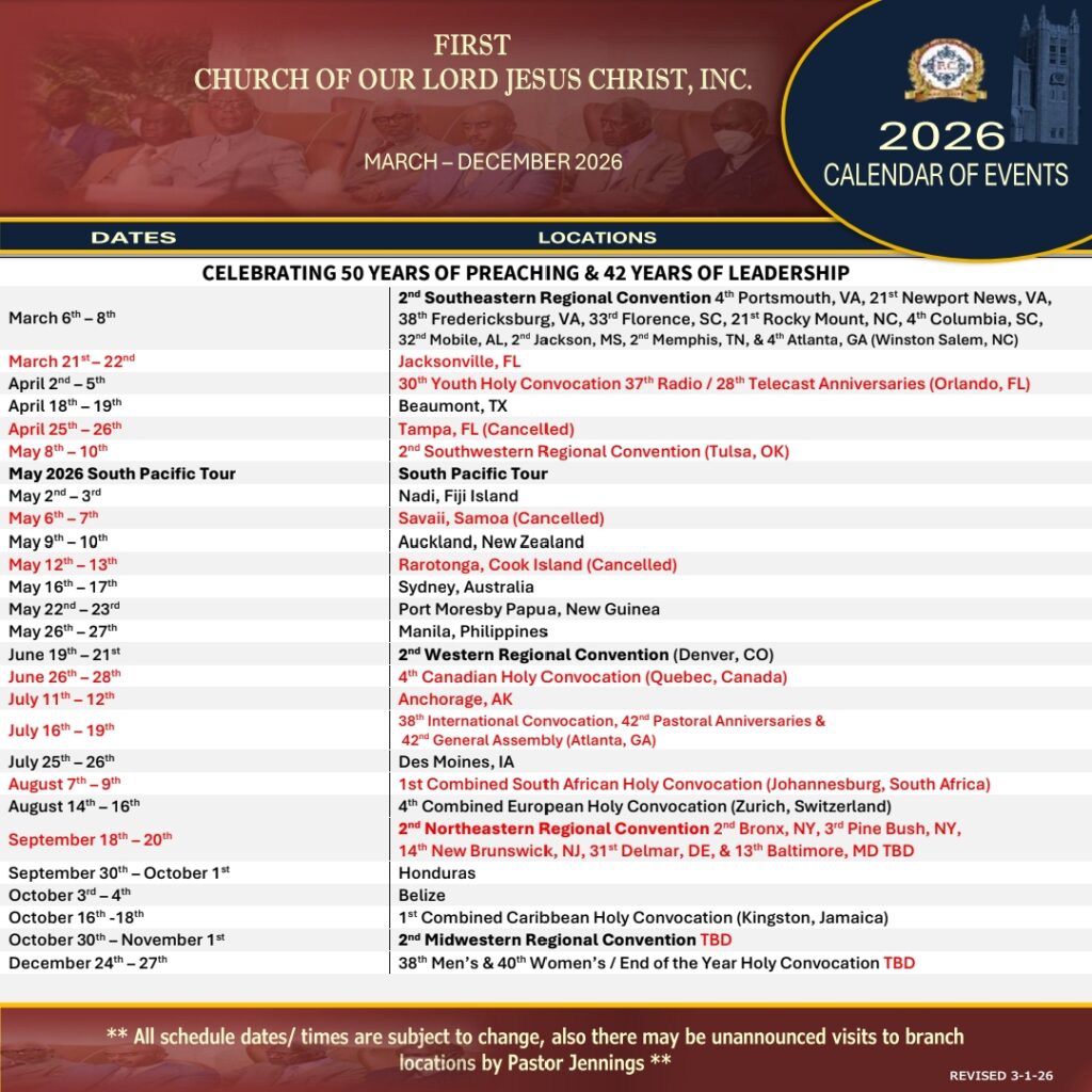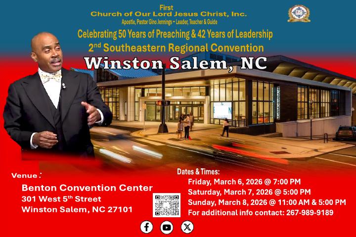 FIRST CHURCH OF OUR LORD JESUS CHRIST Acts 2:38 – “Then Peter said unto them, Repent, and be baptized every one of you in the name of Jesus Christ for the remission of sins, and ye shall receive the gift of the Holy Ghost.” Hours Tuesday & Thursday @ 7pm Sunday @ 11am & 5pm Arrive Early for Parking HQ Location 5105 N. 5th Street Philadelphia, PA. 19120 Get Directions to F.C. Events Follow the Truth of God around the world... See Scheduled Events Temples Visit a branch temple See worldwide locations Find a Branch Temple Scheduled Events UPCOMING Conventions & Convocations March 6 - 8, 2026 / S.E. Regional Convention April 2 - 5, 2026 / Youth Holy Convocation June 19 - 21, 2026 / 2nd. Western Regional Convention August 14 - 16, 2026 / 4th Combined European Convocation See More United States Events International Events Auxiliary Events Souls Baptized In 2025 8,682 – Souls baptized around the world during the year 2025. Please keep them all in your prayers. Souls Baptized In 2024 12,087 – Souls baptized around the world during the year 2024. Please keep them all in your prayers. Souls Baptized In 2023 8,500 – Souls baptized around the world during the year 2023. Please keep them all in your prayers. F.C. Convention Center Fundraiser Raised Over - $2,238,300 FC Convention CenterUpdate Coming Soon... Donate to the F.C. Convention Center Fundraiser Tithes & Offering $1,000 Sacrifice FC DisasterRelief Fund Cafeteria Renovation Brotherhood Sacrifice First ChurchYouth Captain FC Vendor & Business Comm. Visit Apostle, Pastor Gino Jennings In Winston Salem, NC / March 6 - 8, 2026 Browse our Calendar of Events Calendar of Events2026 Plan Your Trip & Make Travel Arrangements Early.Follow Apostle, Pastor Gino Jennings. Read the "Truth of God Times" and stay updated with First Church news and events from around the world. Celebrating 50 Years of Preaching & 42 Years of Leading God’s People Truth of God Times Remembering The Saints of God From Around The World Watch & Listen to the TRUTH OF GOD BROADCAST Matthew 11:15 - He that hath ears to hear, let him hear. Most Recent Video Upcoming Events Convention Center Watch More Videos Purchase The Holy Scriptures Buy Now Youth Captains Proverbs 22:6 - Train up a child in the way he should go: and when he is old, he will not depart from it. International Youth Mass Choir Quarterly Events Schedule Thank God For Our Youth. SUPPORT OUR YOUTH FOLLOW APOSTLE PASTOR GINO JENNINGS "We bear witness there is only one God" FOLLOW APOSTLE PASTOR GINO JENNINGS "Follow me in your Bible" FOLLOW APOSTLE PASTOR GINO JENNINGS "Am I Right" Follow The Truth Of God Train Worldwide Acts 5:20 - Go, stand and speak in the temple to the people all the words of this life. Contact First Church Of Our Lord Jesus Christ www.truthofgod.com | firstchurch@fcooljc.org Call Us @ +1-888-231-2201 / +215-455-8106
