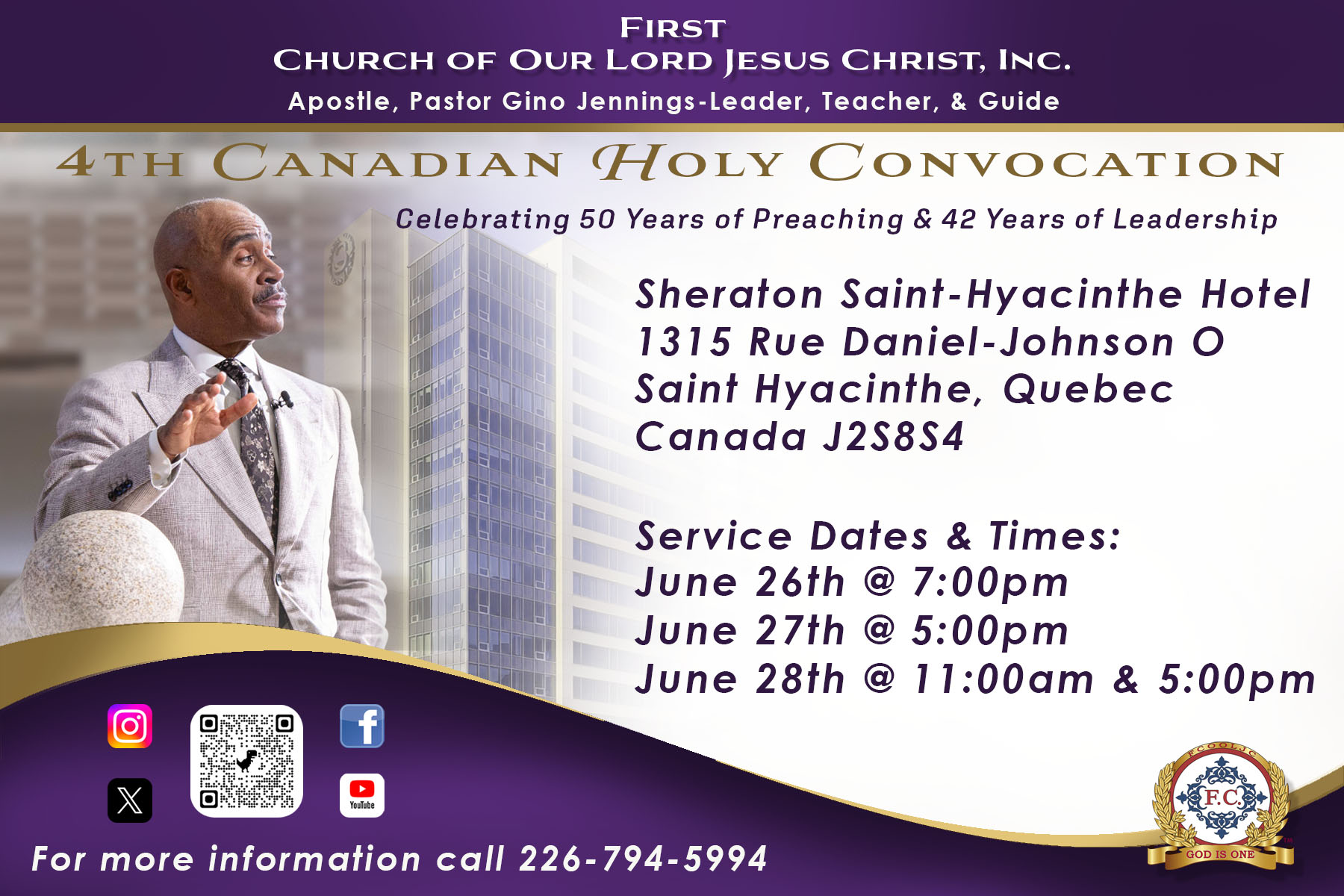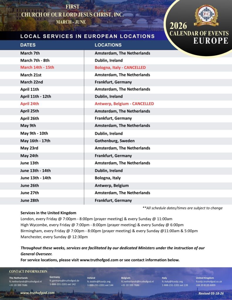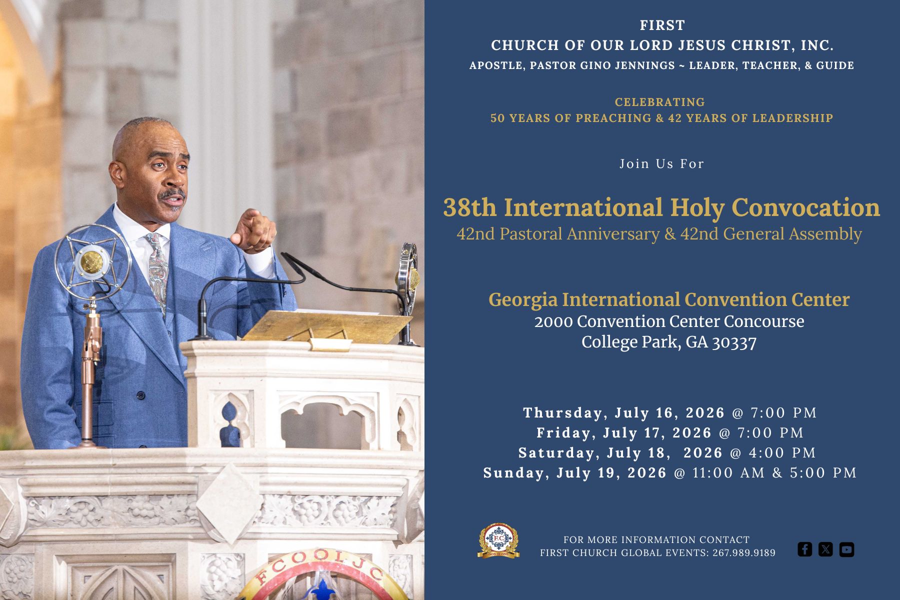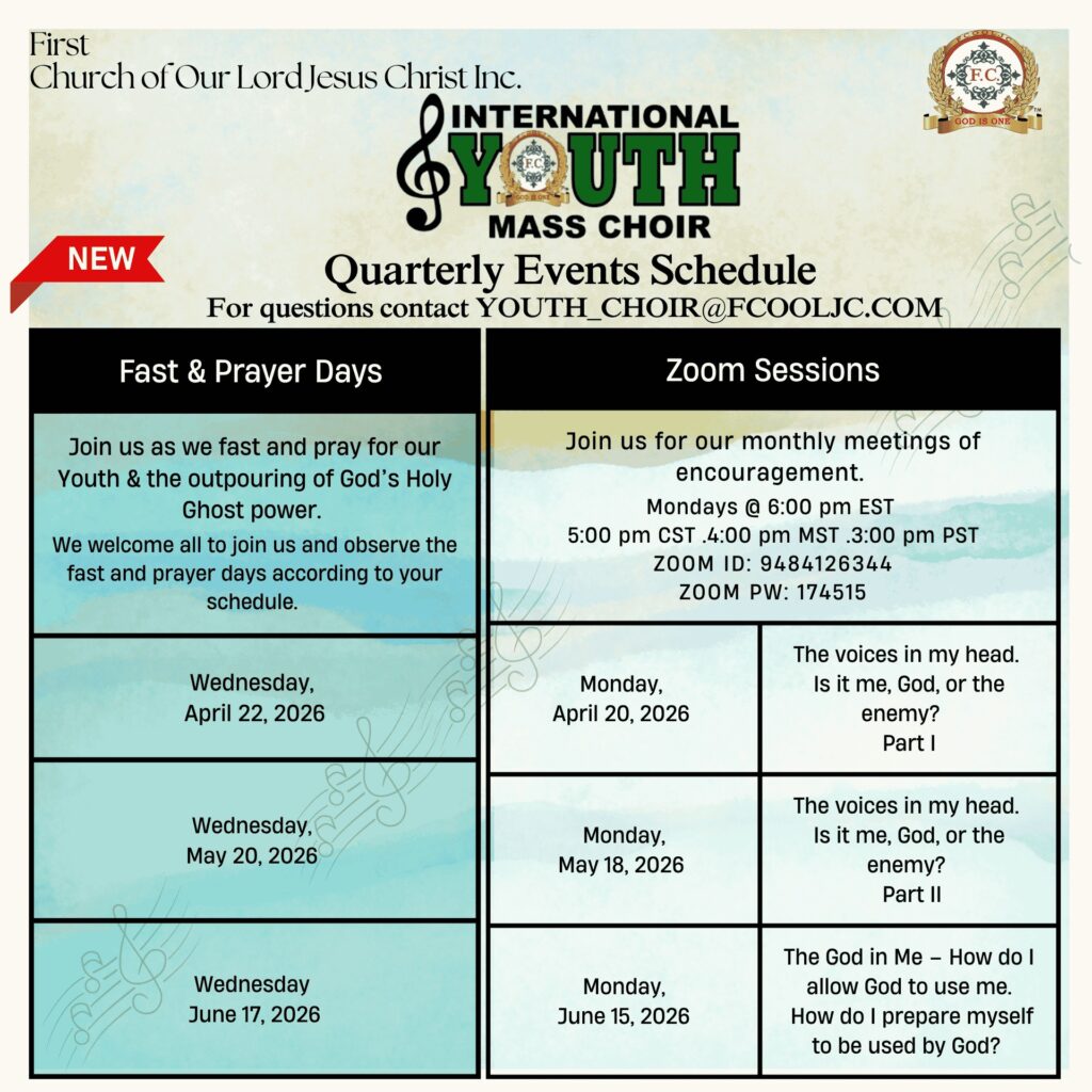 FIRST CHURCH OF OUR LORD JESUS CHRIST Acts 2:38 – “Then Peter said unto them, Repent, and be baptized every one of you in the name of Jesus Christ for the remission of sins, and ye shall receive the gift of the Holy Ghost.” Hours Tuesday & Thursday @ 7pm Sunday @ 11am & 5pm Arrive Early for Parking HQ Location 5105 N. 5th Street Philadelphia, PA. 19120 Get Directions to F.C. Events Follow the Truth of God around the world... See Scheduled Events Temples Visit a branch temple See worldwide locations Find a Branch Temple Scheduled Events UPCOMING Conventions & Convocations May 8 - 10. 2026 / 2nd S.W. Regional Convention June 19 - 21, 2026 / 2nd. Western Regional Convention June 26 - 28, 2026 / 4th Canadian Holy Convocation July 16 - 19, 2026 / Atlanta, Georgia / 38th Int. Convocation See Calendar United States Events International Events Auxiliary Events F.C. News & Updates: 4th Combined European Convocation / Zurich, Switzerland Beaumont, Texas / April 18 – 19, 2026 2nd Southwestern Regional Convention, Tulsa, OK 4th Canadian Holy Convocation UPCOMING EVENTS SOUTH PACIFIC TOUR Nadi, Fiji – May 2–3, 2026 Auckland, New Zealand – May 9–10, 2026 Sydney, Australia – May 16–17, 2026 Port Moresby, Papua New Guinea – May 22–23, 2026 Manila, Philippines – May 26–27, 2026 TULSA, OKLAHOMA APOSTLE, PASTOR GINO JENNINGS We look forward to seeing Brothers, Sisters and Visitors at Tulsa, Oklahoma on May 8 - 10, 2026; for the 2nd Southwestern Regional Convention Click For Details Souls Baptized In 2025 8,682 – Souls baptized around the world during the year 2025. Please keep them all in your prayers. Souls Baptized In 2024 12,087 – Souls baptized around the world during the year 2024. Please keep them all in your prayers. Souls Baptized In 2023 8,500 – Souls baptized around the world during the year 2023. Please keep them all in your prayers. F.C. Convention Center Fundraiser Raised - $2,366,621 / Online Only FC Convention CenterUpdate Coming Soon... Donate to the F.C. Convention Center Fundraiser Tithes & Offering $1,000 Sacrifice FC DisasterRelief Fund Cafeteria Renovation Brotherhood Sacrifice First ChurchYouth Captain FC Vendor & Business Comm. Visit Apostle, Pastor Gino Jennings In Quebec, Canada / June 26 - 28, 2026 Browse our Scheduled Events Calendar of Events2026 Plan Your Trip & Make Travel Arrangements Early.Follow Apostle, Pastor Gino Jennings. Read the "Truth of God Times" and stay updated with First Church news and events from around the world. Celebrating 50 Years of Preaching & 42 Years of Leading God’s People Truth of God Times Remembering The Saints of God From Around The World Watch & Listen to the TRUTH OF GOD BROADCAST Matthew 11:15 - He that hath ears to hear, let him hear. Most Recent Video Upcoming Events Convention Center Watch More Videos Purchase The Holy Scriptures Buy Now Youth Captains Proverbs 22:6 - Train up a child in the way he should go: and when he is old, he will not depart from it. International Youth Mass Choir Quarterly Events Schedule Thank God For Our Youth. SUPPORT OUR YOUTH FOLLOW APOSTLE PASTOR GINO JENNINGS "We bear witness there is only one God" FOLLOW APOSTLE PASTOR GINO JENNINGS "Follow me in your Bible" FOLLOW APOSTLE PASTOR GINO JENNINGS "Am I Right" Follow The Truth Of God Train Worldwide Acts 5:20 - Go, stand and speak in the temple to the people all the words of this life. Contact First Church Of Our Lord Jesus Christ www.truthofgod.com | firstchurch@fcooljc.org Call Us @ +1-888-231-2201 / +215-455-8106