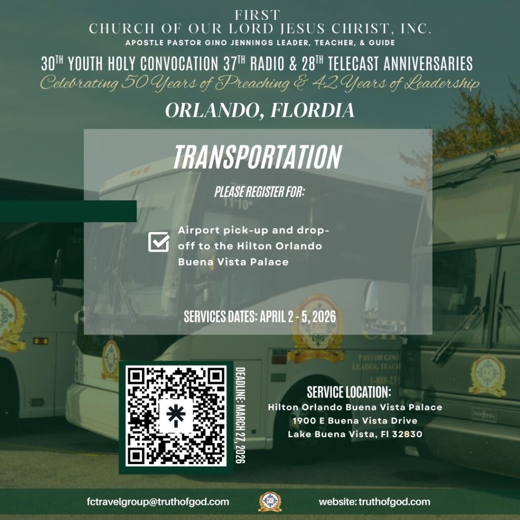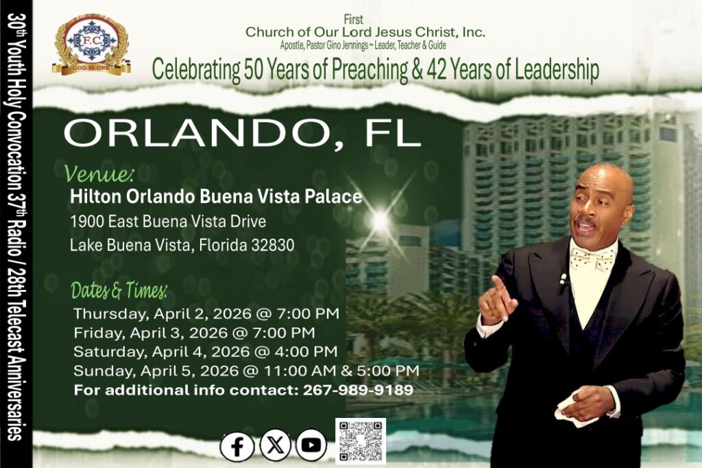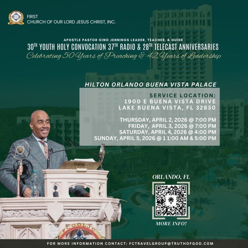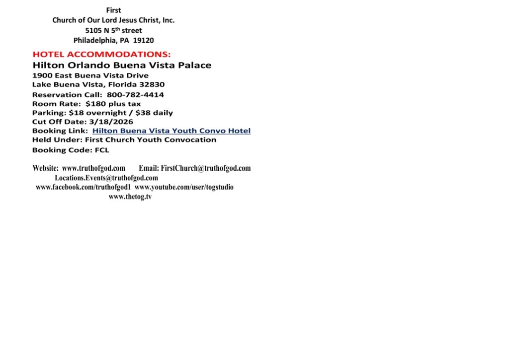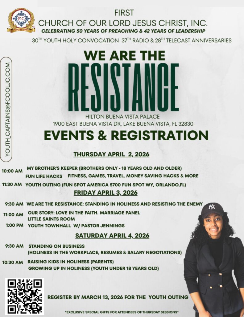Youth Holy Convocation / Orlando, FL / April 2 – 5, 2026Scheduled Events Important Registration Links Deadline to register for April 2nd Youth Outing to Fun Spot Orlando is March 13th at midnight. Registration link: https://fcooljc.info/yc2026-outing-registration Cut-off to book hotel accommodations under church rate is: March 18, 2026. Registration link: https://linktr.ee/firstchurchncc Transportation registration deadline for those needing assistance upon arriving to Orlando is March 27, 2026. Registration link: https://fcooljc.info/yc2026-transportation Previous Post 2nd Southeastern Regional Convention / Winston - Salem, NC / March 6 - 8, 2026 Next Post Jacksonville, Florida - March 21 - 22, 2026